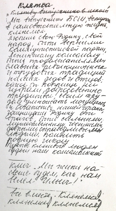 Любить свою Родину, свой народ, быть верными коммунистической партии, Ленинскому комсомолу, быть продолжателями славных революционных и трудовых традиций наших дедов и отцов, какое бы поприще не избрали, добросовестно трудиться, своим трудом умножать могущество и богатство нашей страны, защищать Родину от врагов, быть сильными, мужественными, честными, добрыми, справедливыми людьми, помнить родную школу.